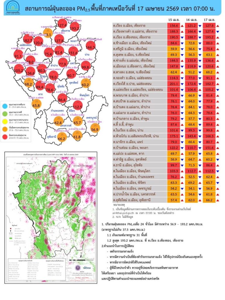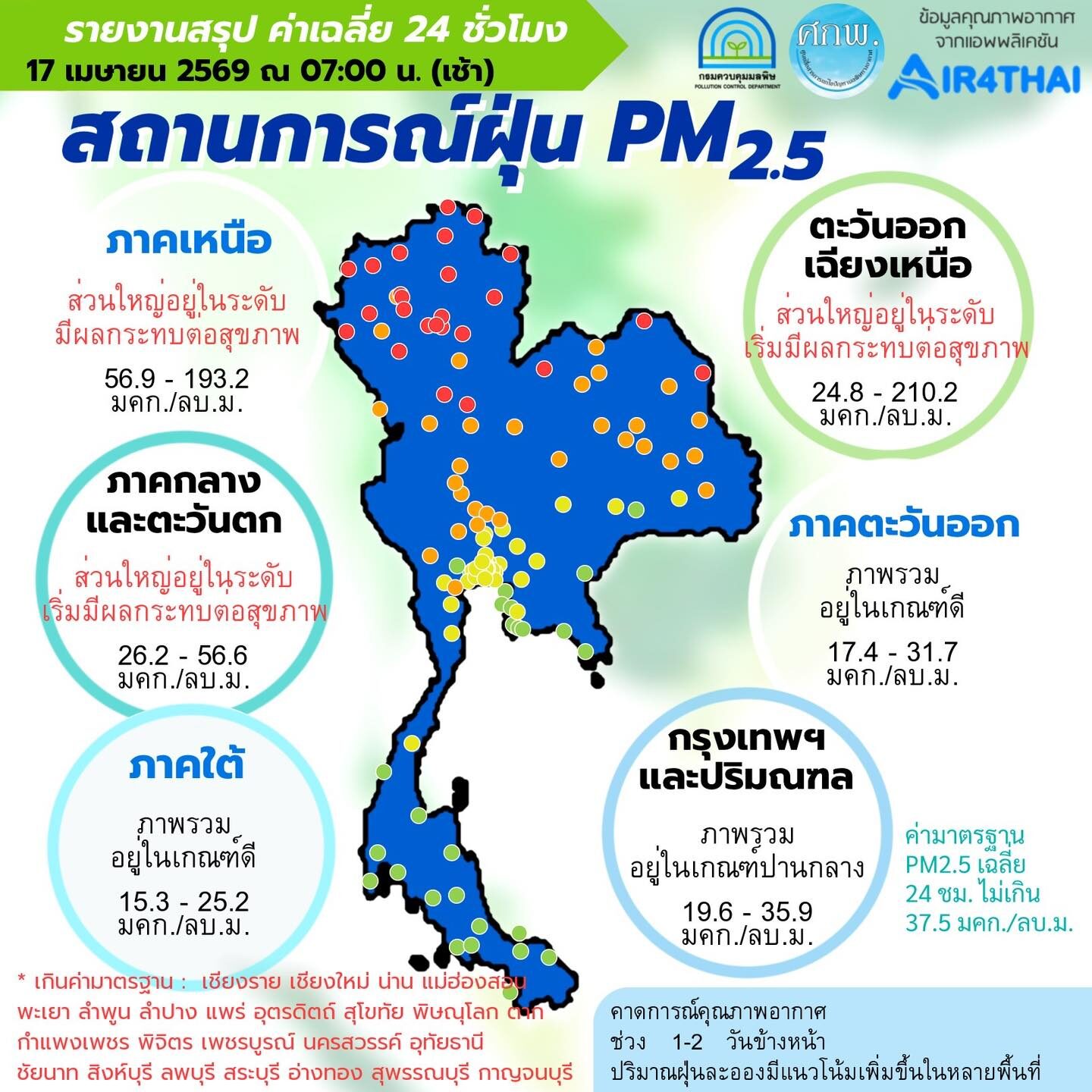 สรุปสถานการณ์ฝุ่น PM2.5 ประจำวันที่ 17 เมษายน 2569 ในแต่ละภูมิภาคของประเทศไทย มีรายละเอียดดังนี้:
